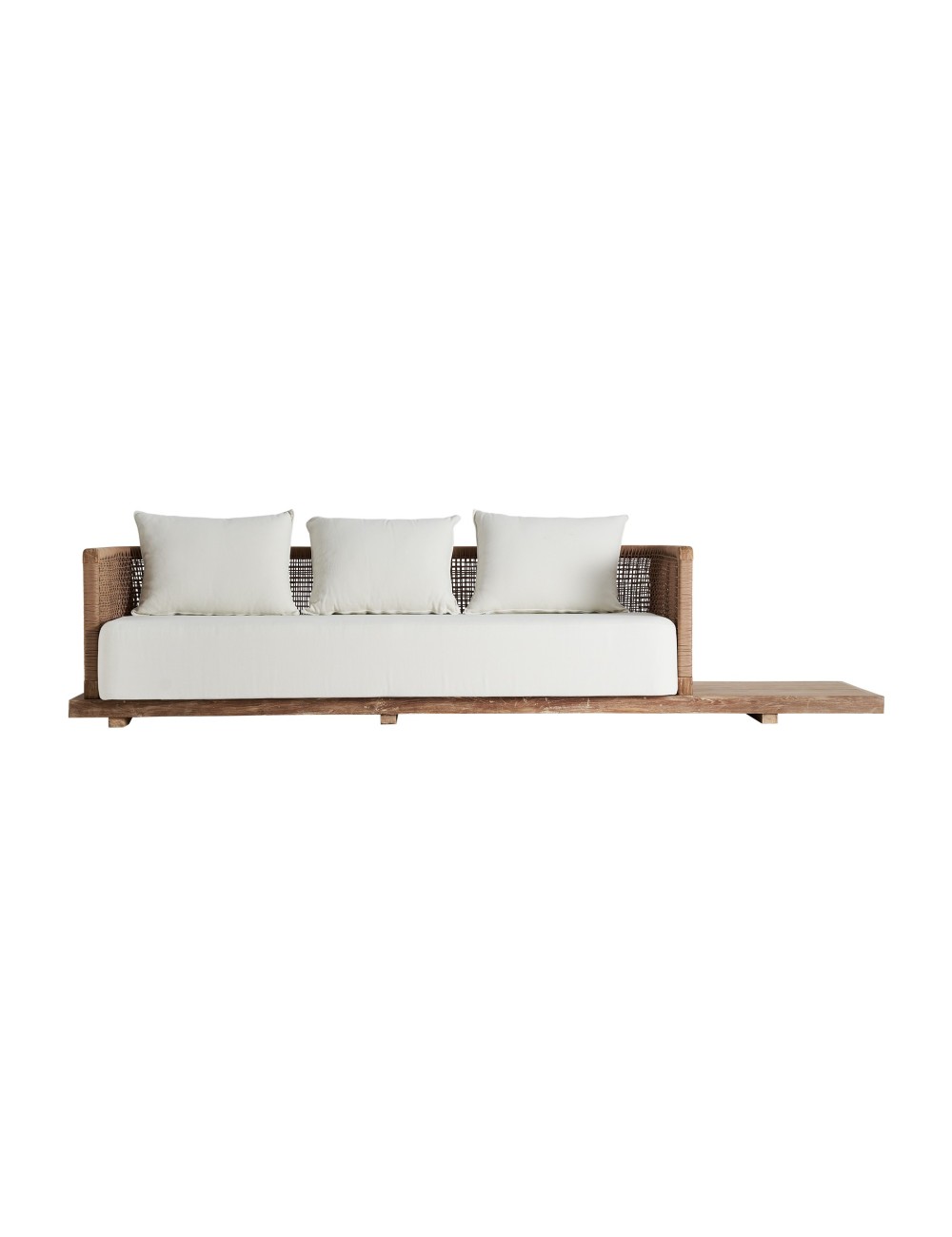 Sofá trena de estilo boho fabricado en madera de teka reciclada en color marrón combinado con polipropileno reciclado en color beige. Producto desmontable desenfundable. Sofá testa de estilo colonial fabricado en madera de teka reciclada en color marrón combinado con polipropileno reciclado y espuma. Producto desmontable desenfundable.