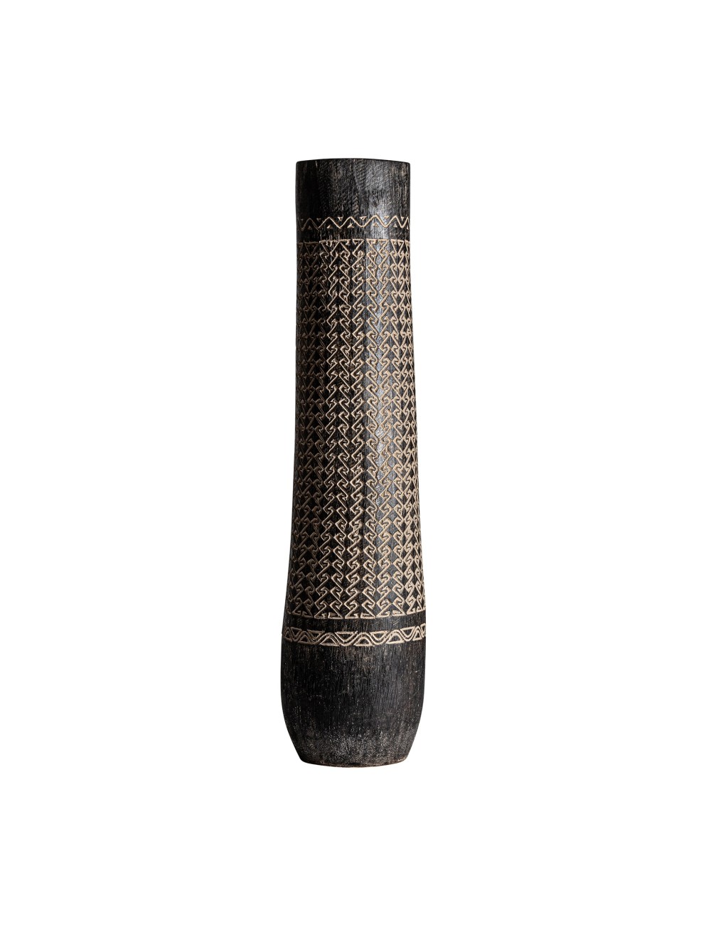 Jarrón nantua de estilo contemporáneo fabricado en madera palma en color tonos en marrón con acabado tallado. | Tinaja fabricado en cemento en color blanco roto combinado con fibra de vidrio. |