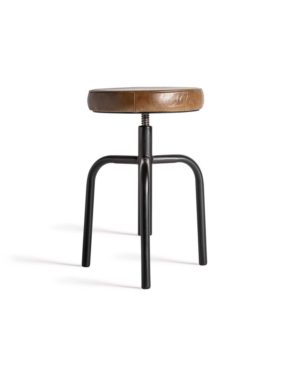 Taburete snait de estilo vintage fabricado en hierro en color negro combinado con cuero cabra en color marrón y espuma.