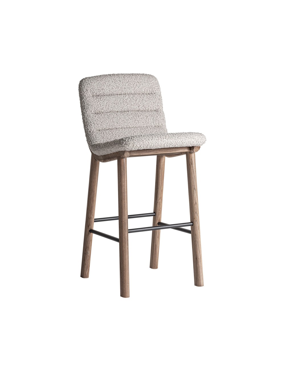 Taburete Jacquard de estilo contemporáneo fabricado en madera de olmo en color marrón claro combinado con poliéster en color beige.
