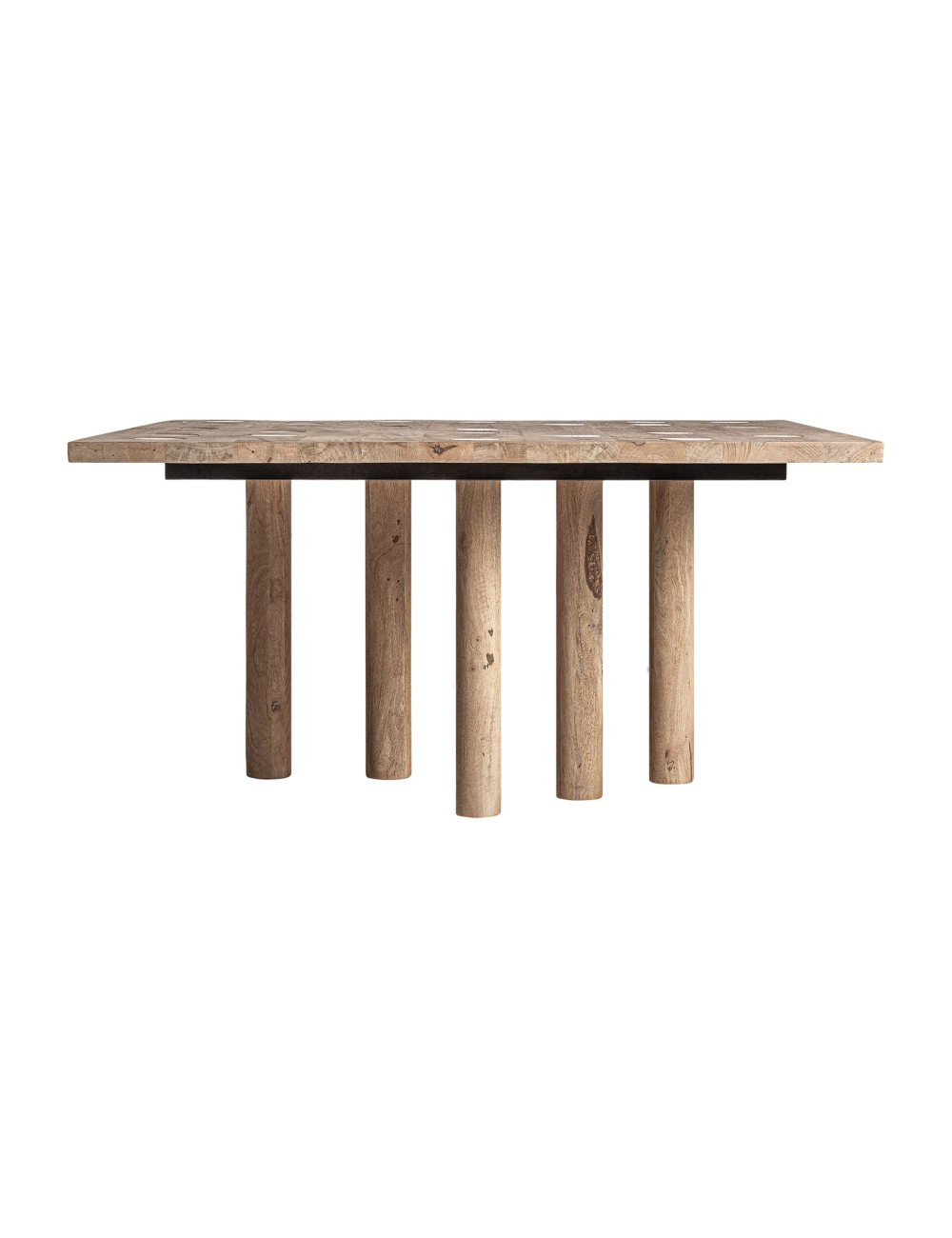 Mesa comedor Jacquard de estilo contemporáneo fabricado en madera de mango en color marrón claro combinado con travertino en color marrón. Producto desmontable.