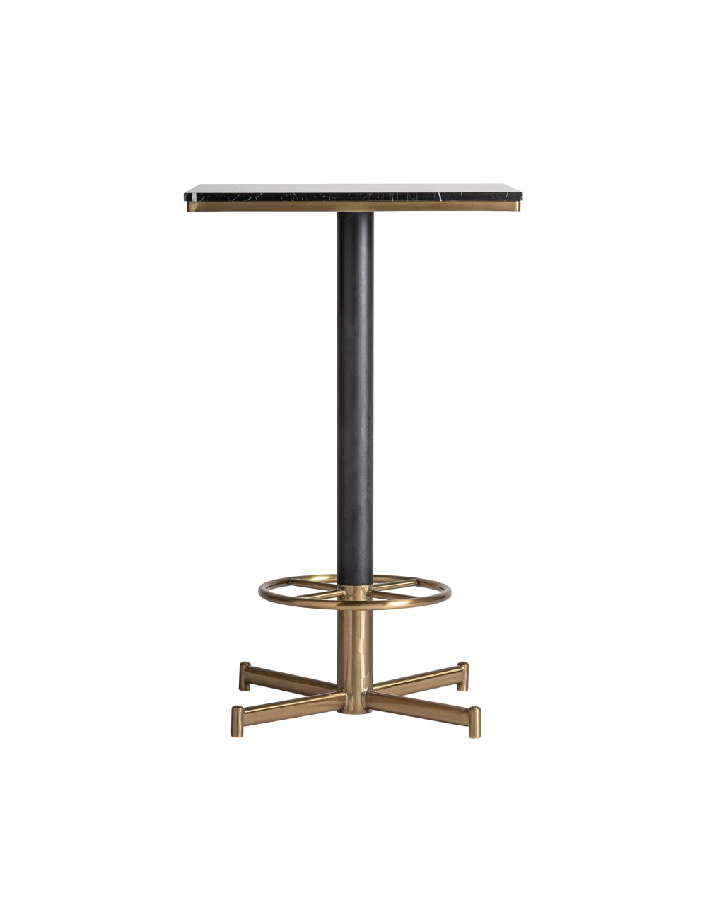 Mesa bar Mhere de estilo art deco fabricado en acero inoxidable en color negro combinado con hierro en color oro y mármol sintético en color negro con acabado veteado.