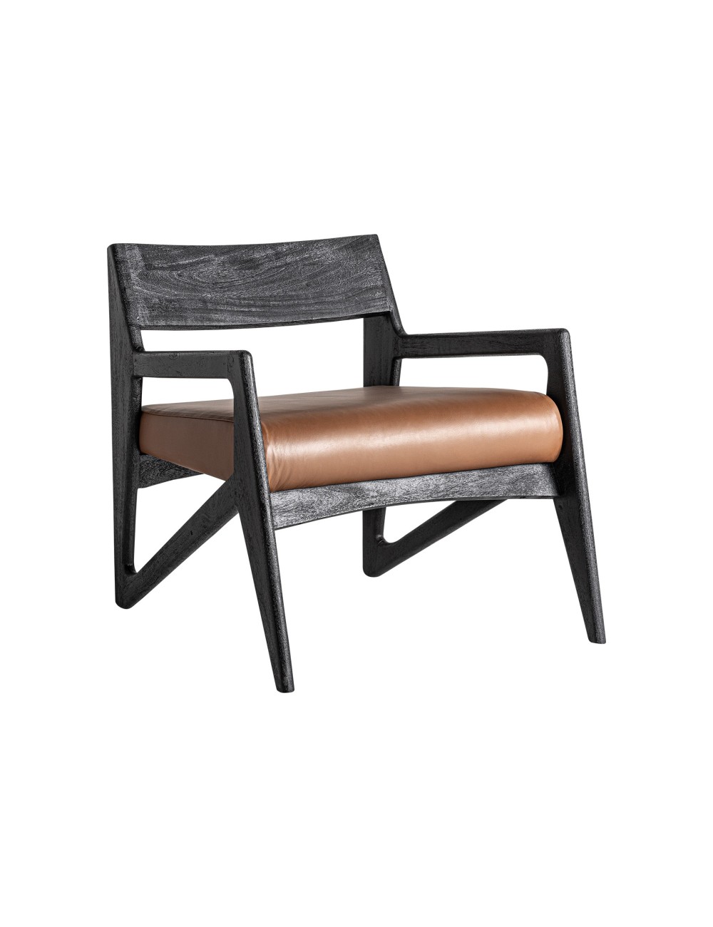 Sillón beslon de estilo contemporáneo fabricado en madera de acacia en color negro combinado con cuero en color marrón.