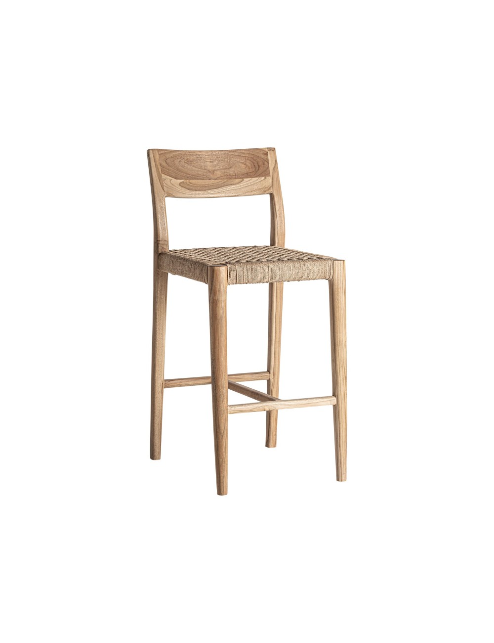 Taburete Vercelli de estilo colonial fabricado en madera de teka en color marrón combinado con fibra natural en color marrón claro.
