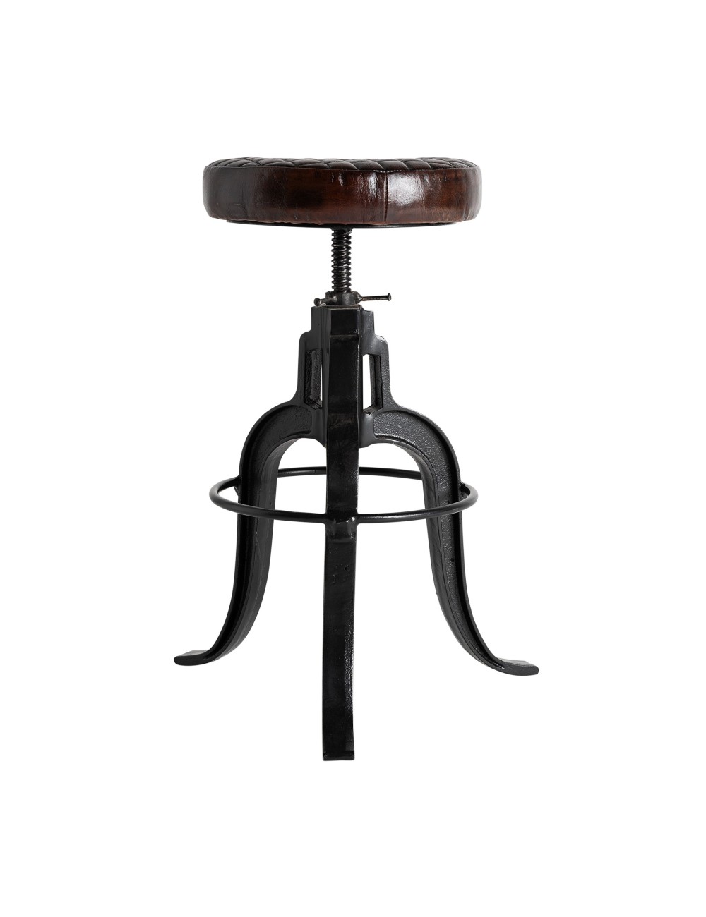Taburete ripley de estilo vintage fabricado en hierro en color negro combinado con cuero en color marrón.