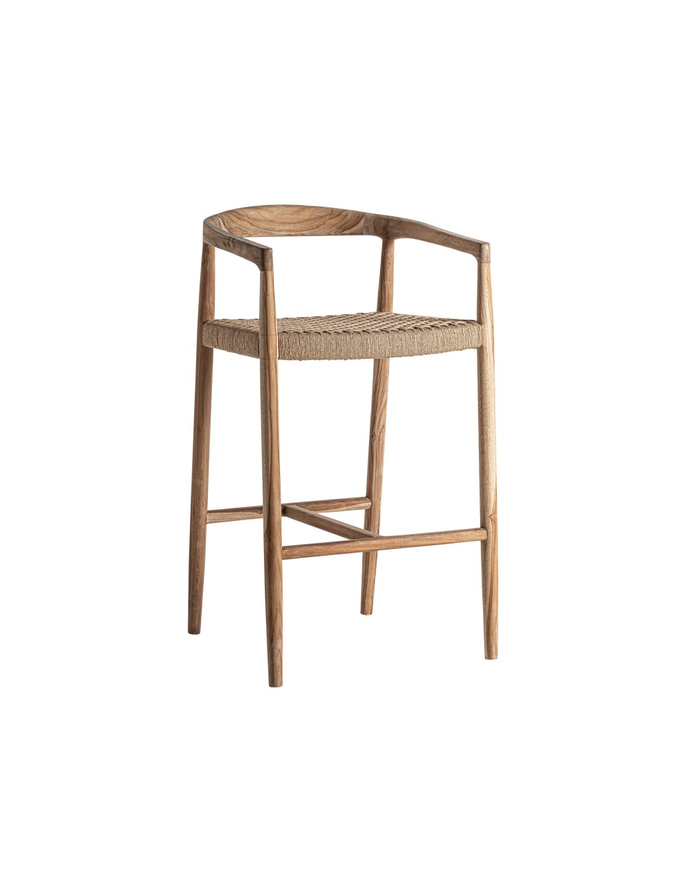 Taburete caen de estilo colonial fabricado en madera de teka en color marrón combinado con fibra natural en color marrón claro.