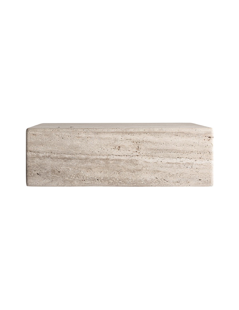 Mesa de centro Rapolano de estilo art deco fabricado en travertino en color beige. | Mesa de centro giswil, en color marrón, de estilo art deco. Fabricado en madera contrachapada, combinado con cristal. Producto desmontable. |