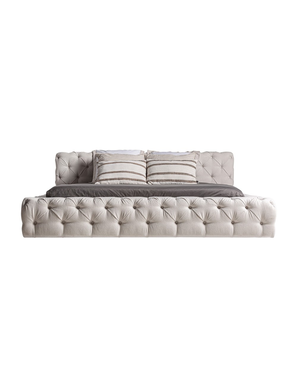 Cama Santorini de estilo provenzal fabricado en tela en color beige combinado con madera de pino y espuma. | Cama dayton de estilo provenzal fabricado en lino en color beige combinado con madera de pino y espuma. Producto desmontable. |