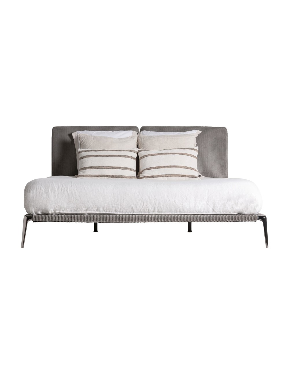 Cama Berlin de estilo contemporáneo fabricado en tela en color gris con acabado oscuro combinado con acero inoxidable en color gris y madera de pino.