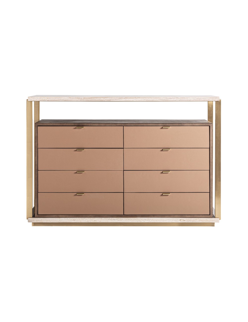 Cómoda monza de estilo art deco fabricado en travertino en color beige combinado con acero inoxidable en color dorado y madera dm en color marrón.