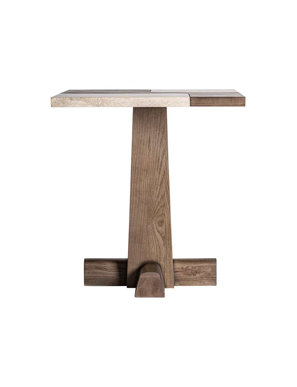 Mesa bar karpacz de estilo contemporáneo fabricado en madera roble en color marrón combinado con travertino en color beige.