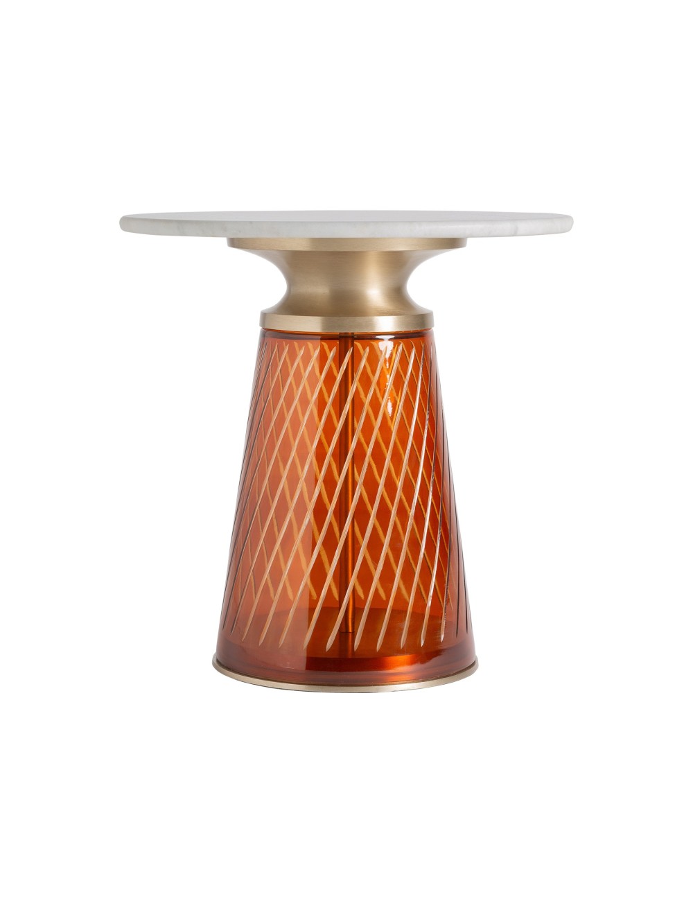 Mesa auxiliar Orvos de estilo art deco fabricado en vidrio en color rojo combinado con mármol en color blanco y acero en color oro.