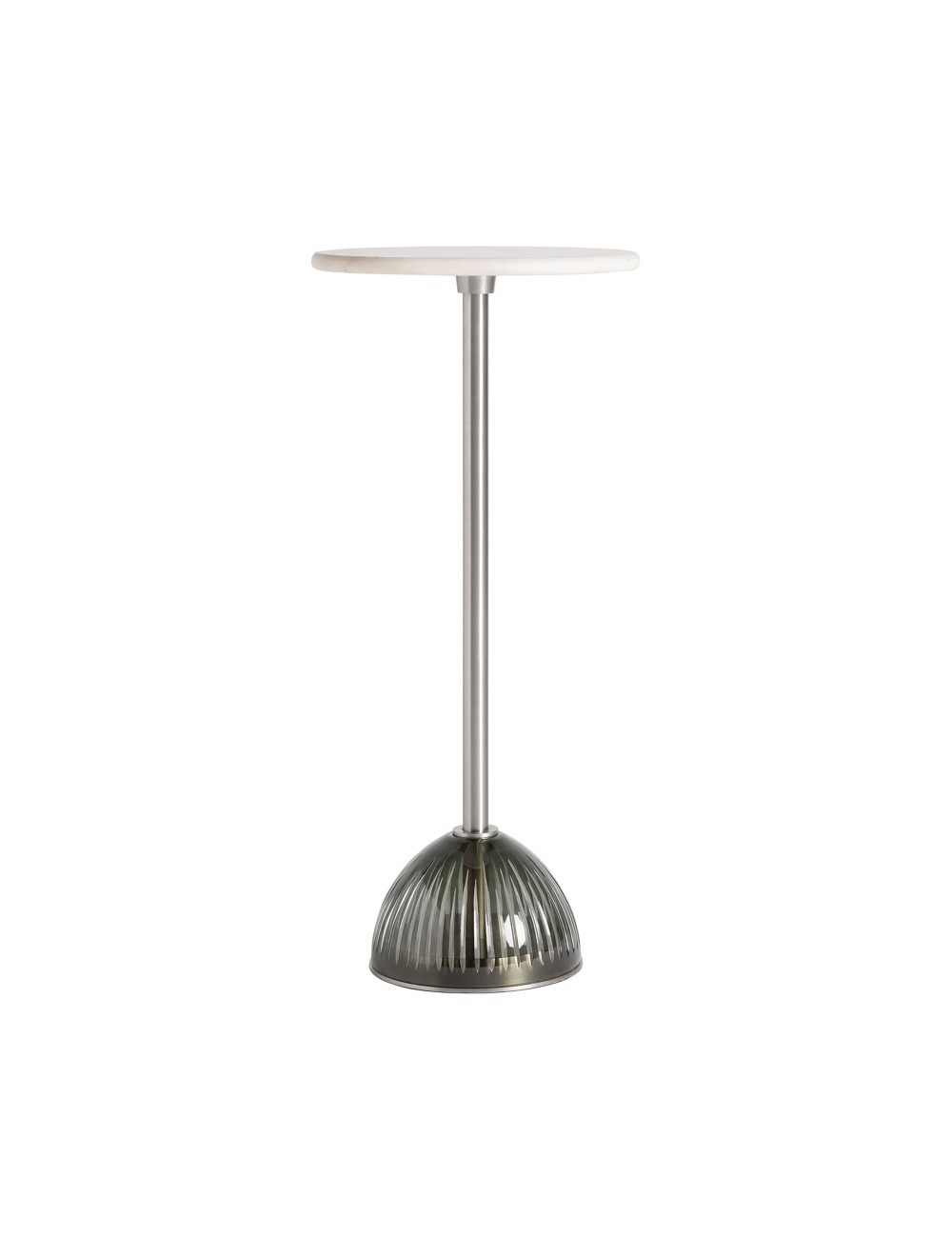 Mesa auxiliar Murano de estilo art deco fabricado en vidrio en color gris combinado con mármol en color blanco y acero en color plata. Producto desmontable.