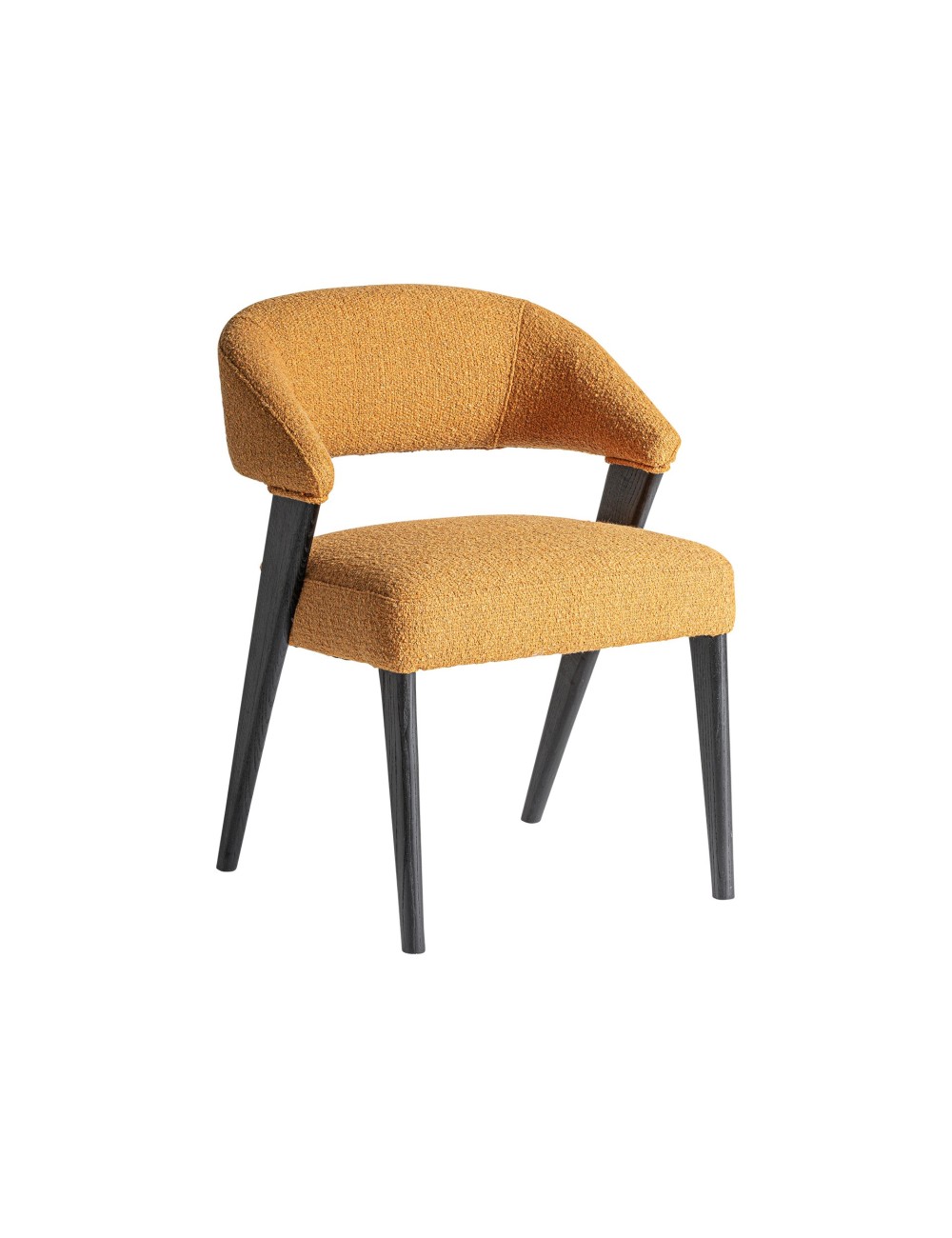 Silla Veney de estilo contemporáneo fabricado en poliéster en color mostaza con acabado jaspeado combinado con madera roble en color negro y madera de caucho.
