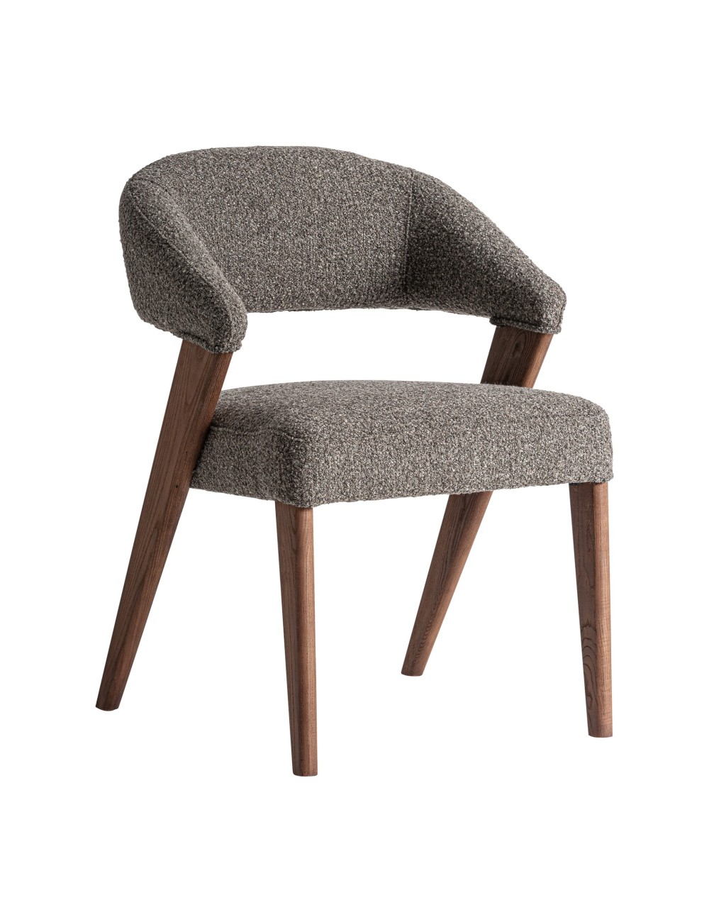 Silla Veney de estilo contemporáneo fabricado en poliéster en color gris con acabado jaspeado combinado con madera roble en color marrón y madera de caucho.