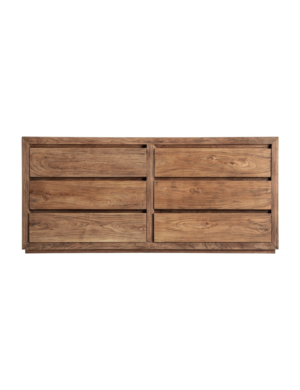 Cómoda Norvik de estilo contemporáneo fabricado en madera de olmo en color marrón. | Cómoda kusel, en color marrón/oro, de estilo contemporáneo. Fabricado en hierro, combinado con madera de mango. Producto desmontable. |
