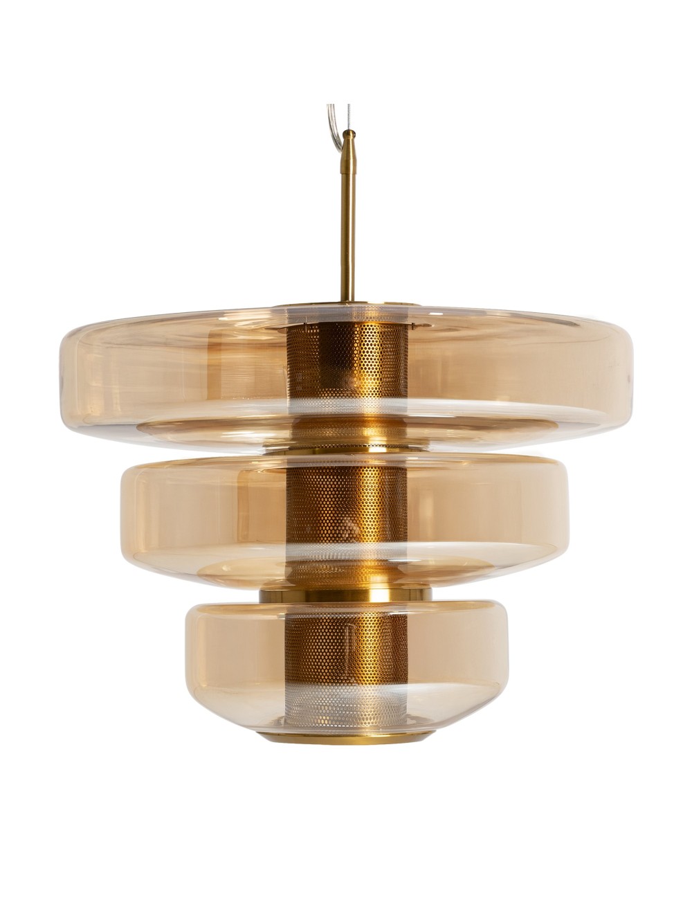 Lámpara de colgar Alexa de estilo art deco fabricado en cristal en color ambar con acabado traslúcido combinado con hierro en color oro.