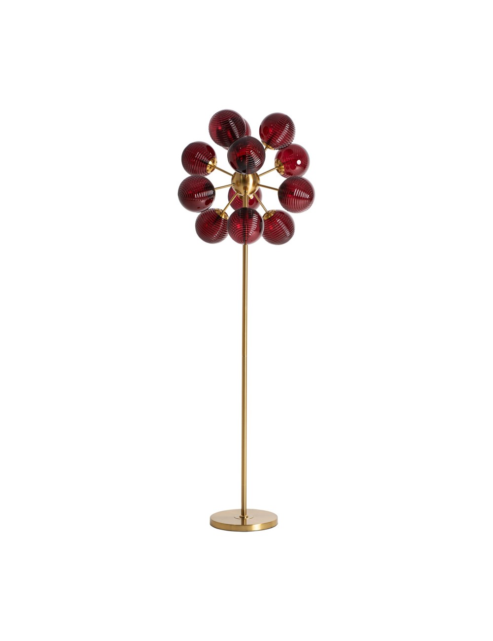 Lámpara de pie Alaia de estilo art deco fabricado en cristal en color burdeos combinado con hierro en color oro. Producto desmontable.