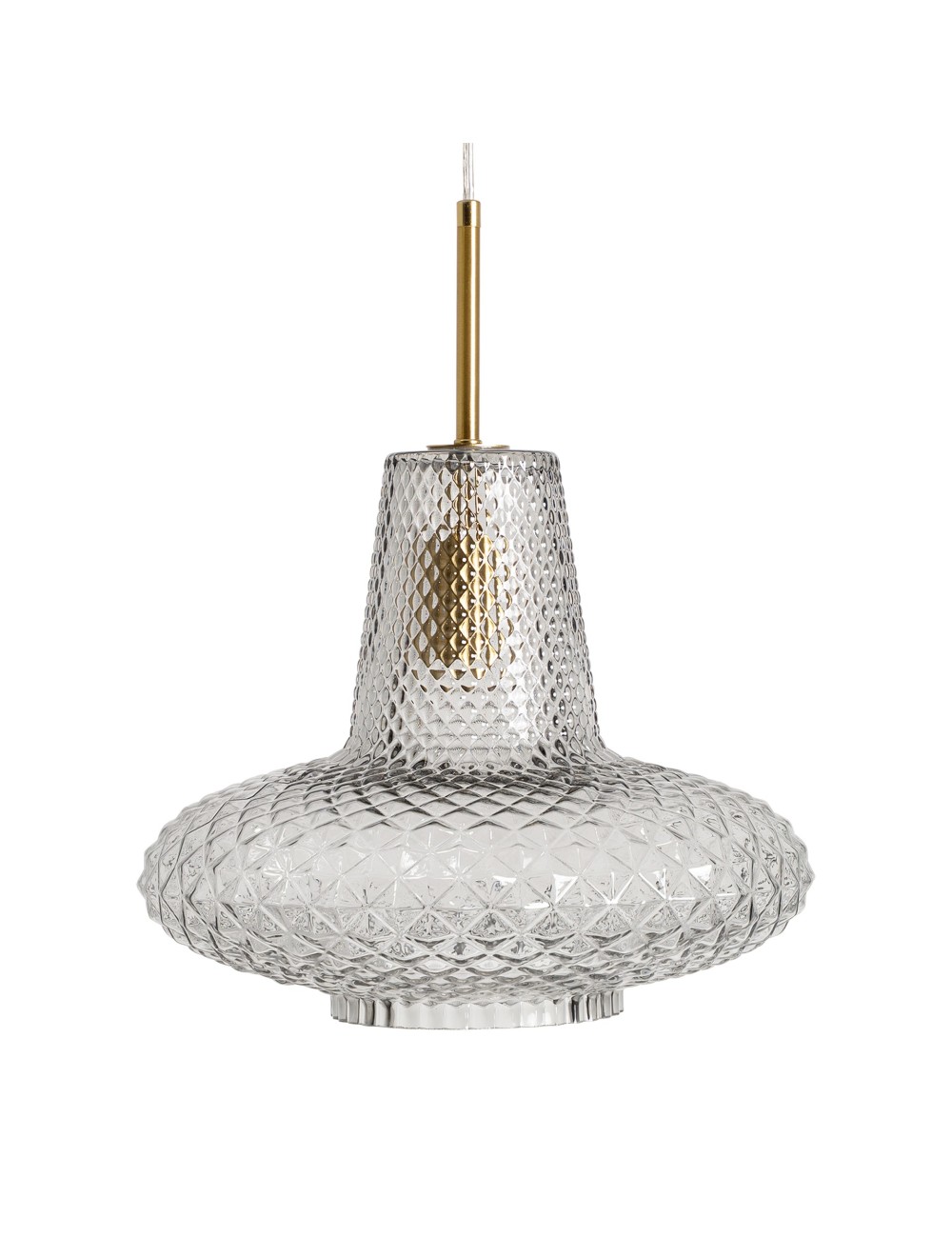 Lámpara de colgar Candela de estilo vintage fabricado en cristal en color transparente con acabado estriado combinado con hierro en color oro. Producto desmontable.