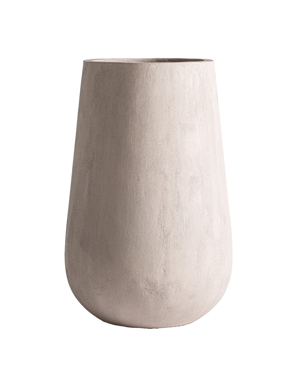 Tinaja Stevie de estilo contemporáneo fabricado en cemento en color topo combinado con fibra de vidrio. | Macetero Miyuka de estilo contemporáneo fabricado en hormigón armado en color gris con acabado envejecido. |