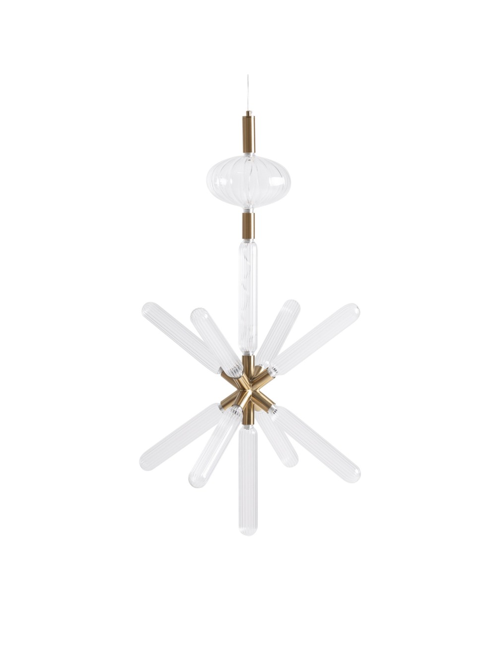 Lámpara de colgar fabricado en cristal en color transparente combinado con acero en color bronce.