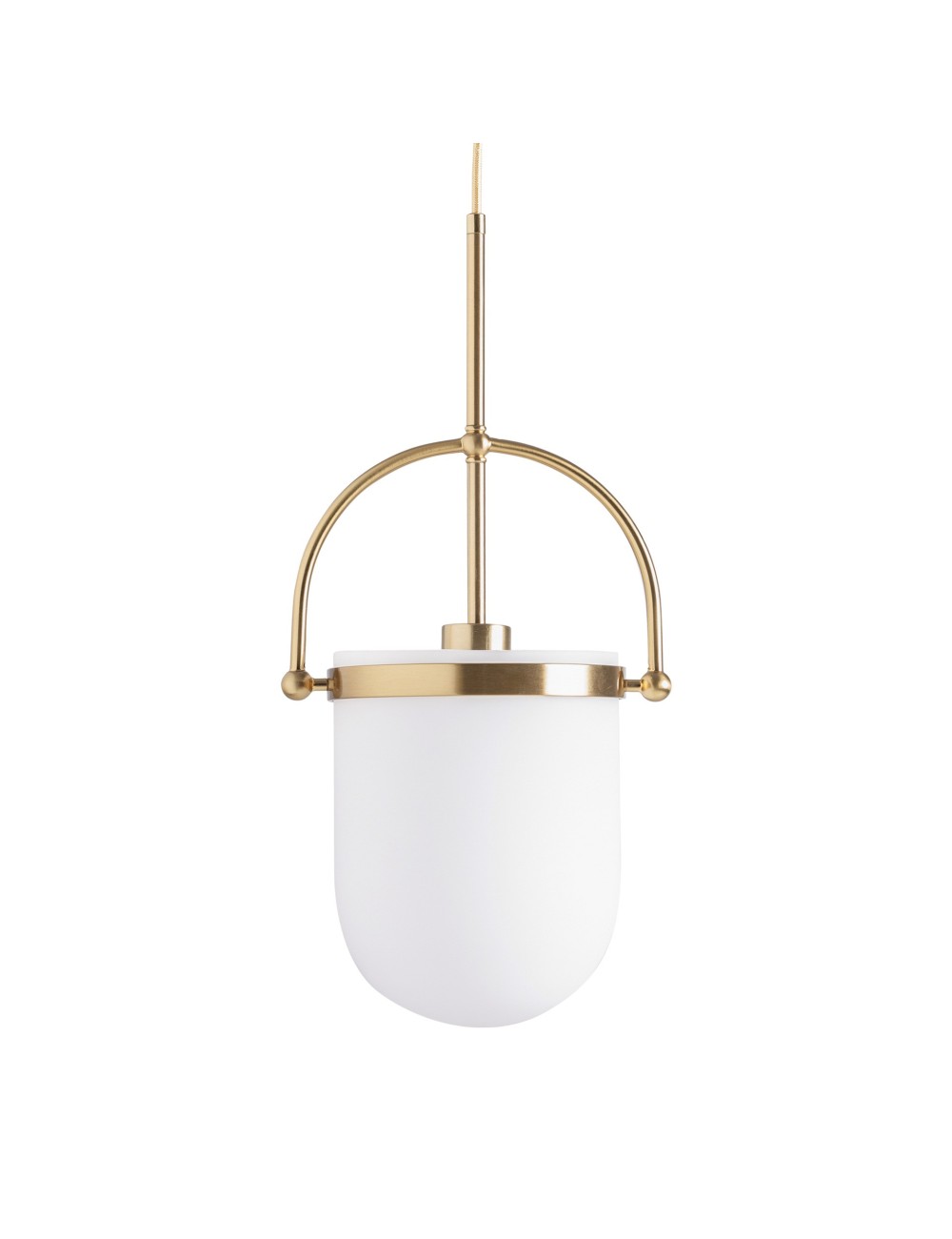Lámpara de colgar Kihe de estilo art deco fabricado en cristal en color blanco combinado con acero en color oro con acabado viejo. Producto desmontable.