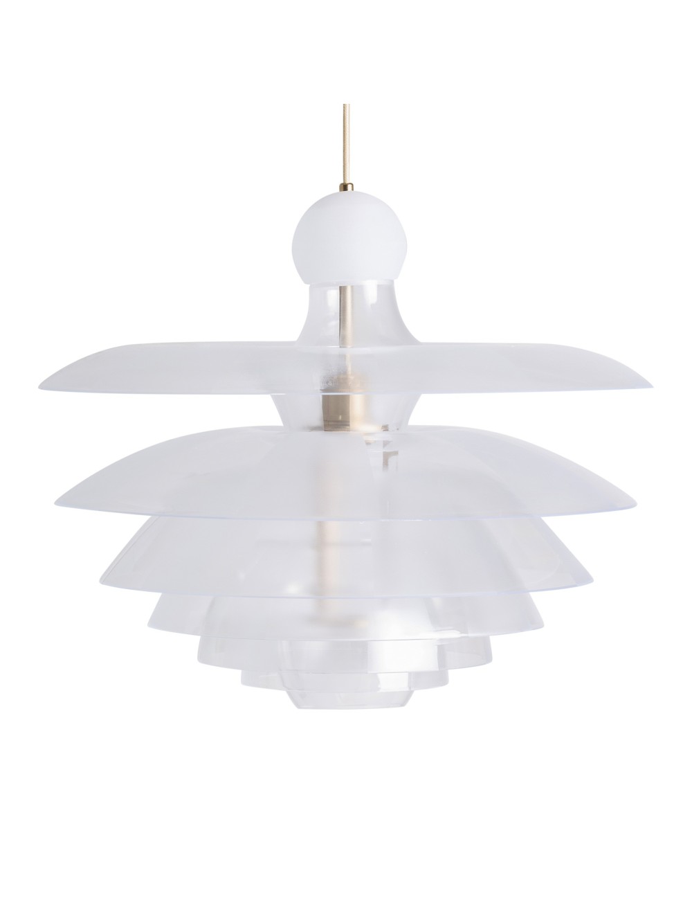 Lámpara de colgar Sasha de estilo art deco fabricado en acrílico en color blanco con acabado traslúcido combinado con hierro en color oro con acabado viejo. Producto desmontable.
