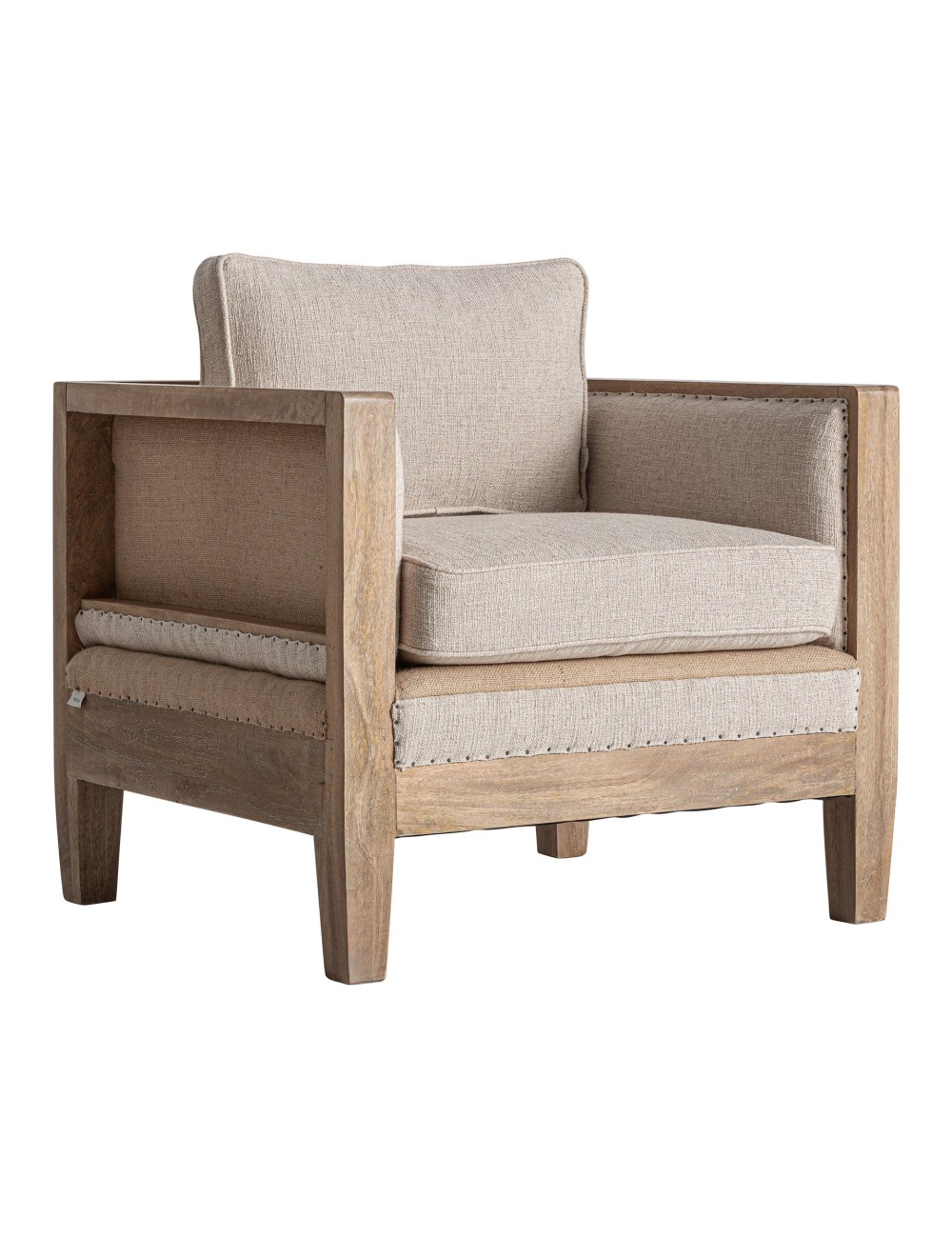 Sillón Grube de estilo clásico fabricado en madera abedul en color marrón combinado con lino en color beige y yute. Producto desenfundable.