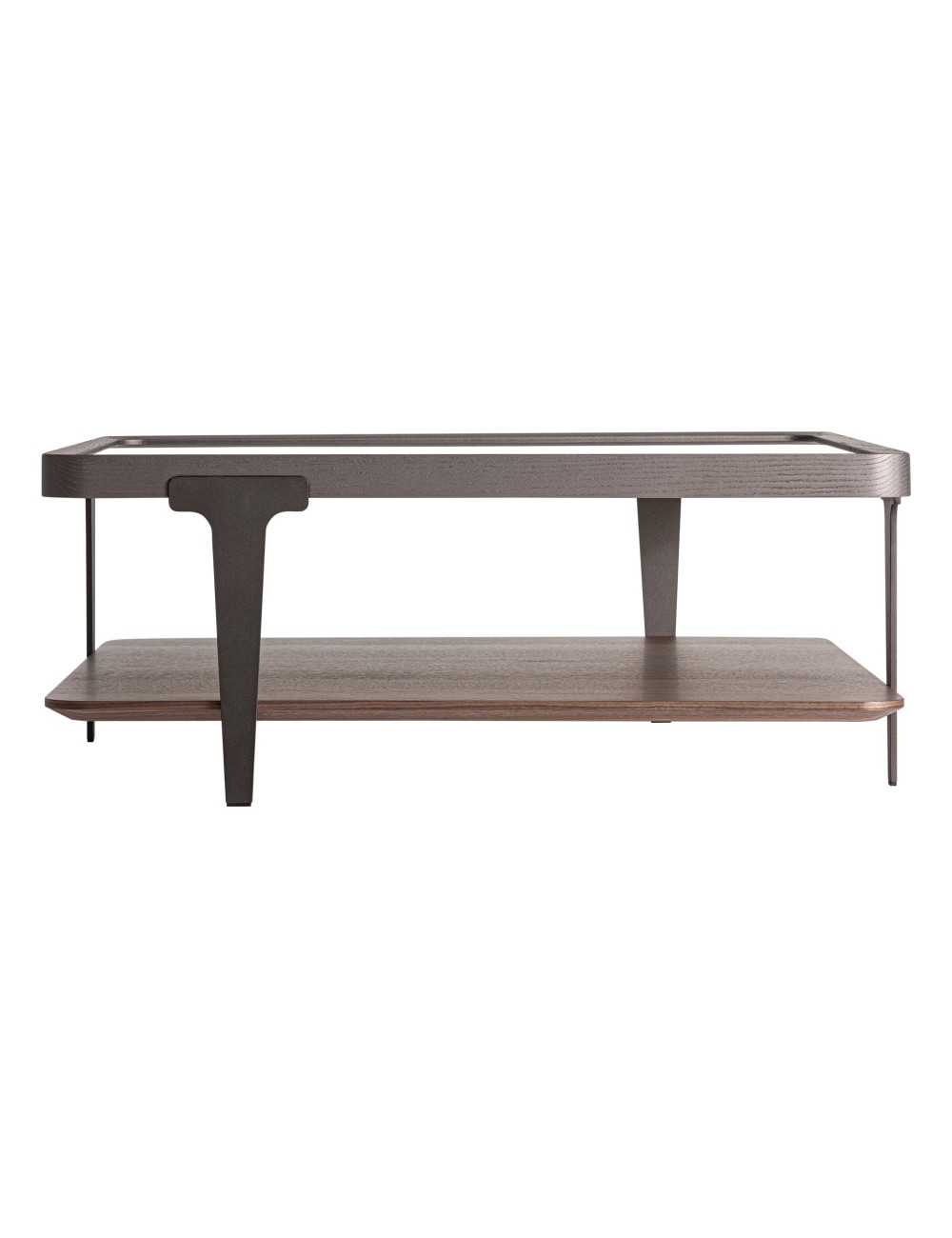 Mesa de centro Gehofen de estilo contemporáneo fabricado en madera de fresno en color marrón combinado con cristal en color gris con acabado ahumado y hierro en color negro. Producto desmontable. | Mesa de centro Brutalist de estilo contemporáneo fabricado en madera de sal en color marrón con acabado teñido. | Mesa de centro Brunbek de estilo contemporáneo fabricado en chapa de roble en color marrón combinado con fibra de vidrio. |