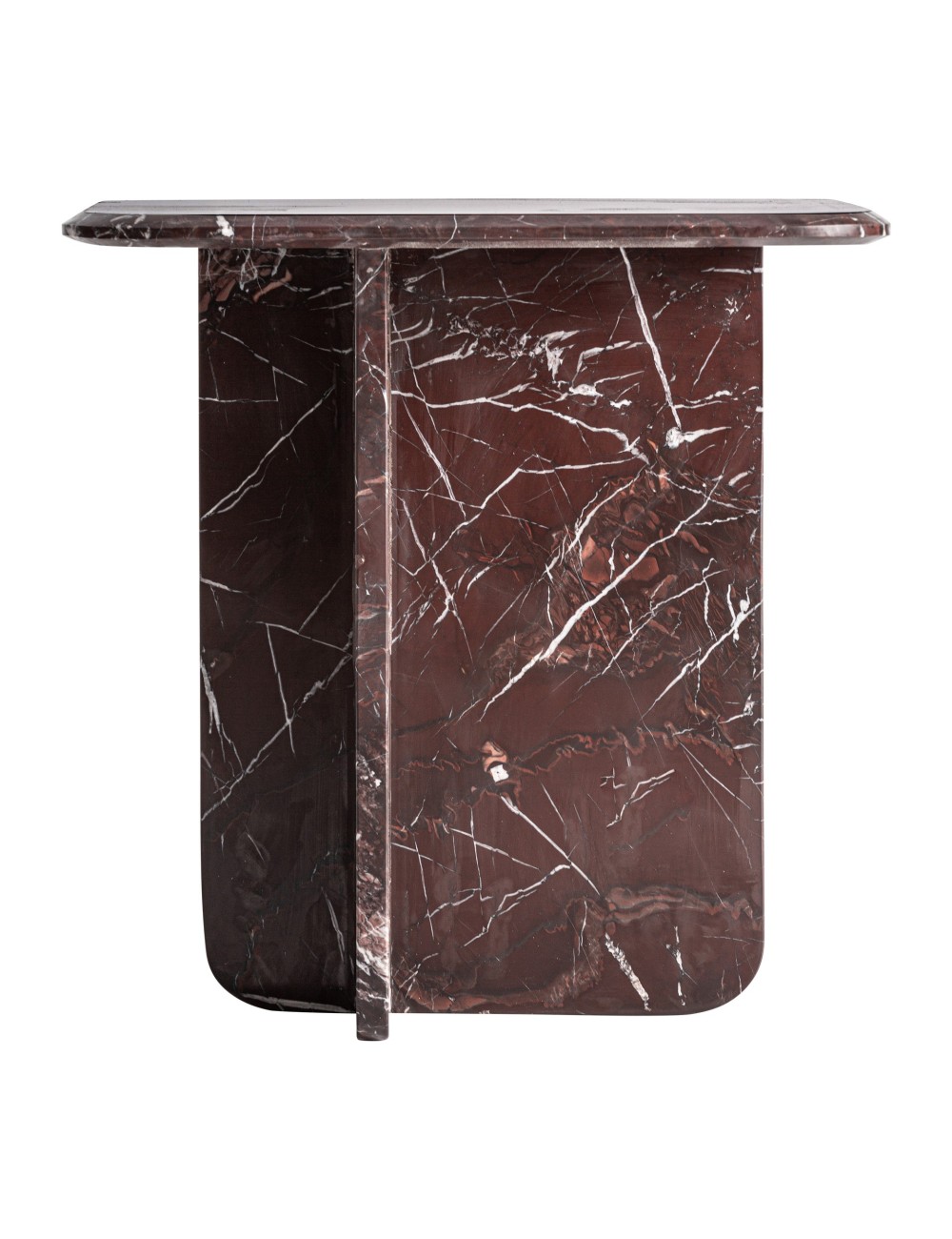 Mesa auxiliar Bourg de estilo contemporáneo fabricado en mármol en color burdeos con acabado brillo. | Mesa auxiliar Thiennes de estilo art deco fabricado en travertino en color beige. |