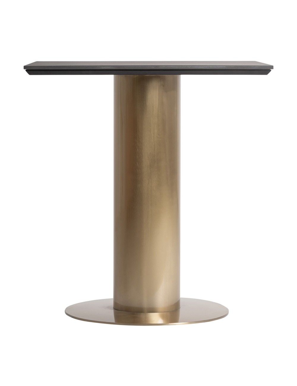 Mesa bar Tasque de estilo art deco fabricado en acero en color oro combinado con porcelánico en color negro. | Mesa bar Rho de estilo contemporáneo fabricado en madera de mango en color marrón combinado con hierro en color negro. Producto desmontable. |
