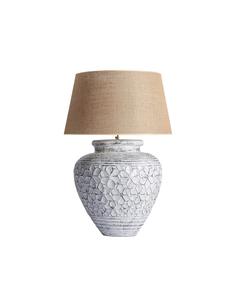 Lámpara de sobremesa de estilo clásico fabricado en terracota en color blanco roto con acabado envejecido combinado con yute en color marrón. Lámpara de sobremesa fabricado en terracota en color verde combinado con algodón en color beige.